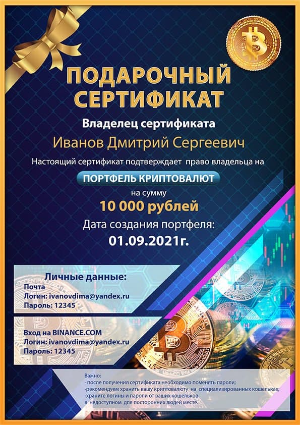 При формировании портфеля криптовалют, мы не спрашиваем у вас логины и пароли от входа на почту и криптобиржу. Вы можете вписать ее на сертификате самостоятельно или не вписывать совсем!
